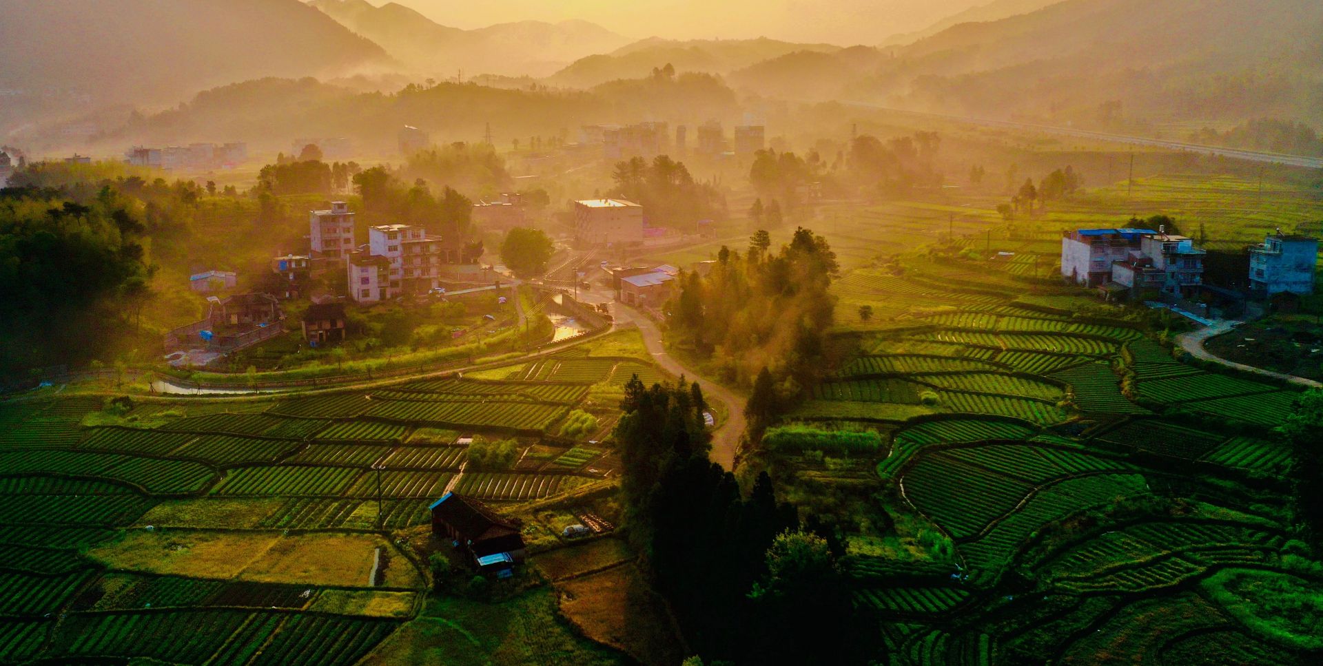 晨曦初照,稻香袭人,微微露出云层的群山温柔地环抱着城郊乡。