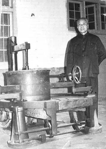张天福在伊达式揉茶机前留影。图源茶道CN公众号